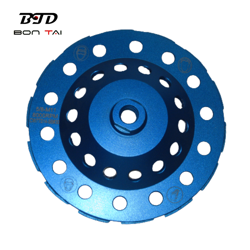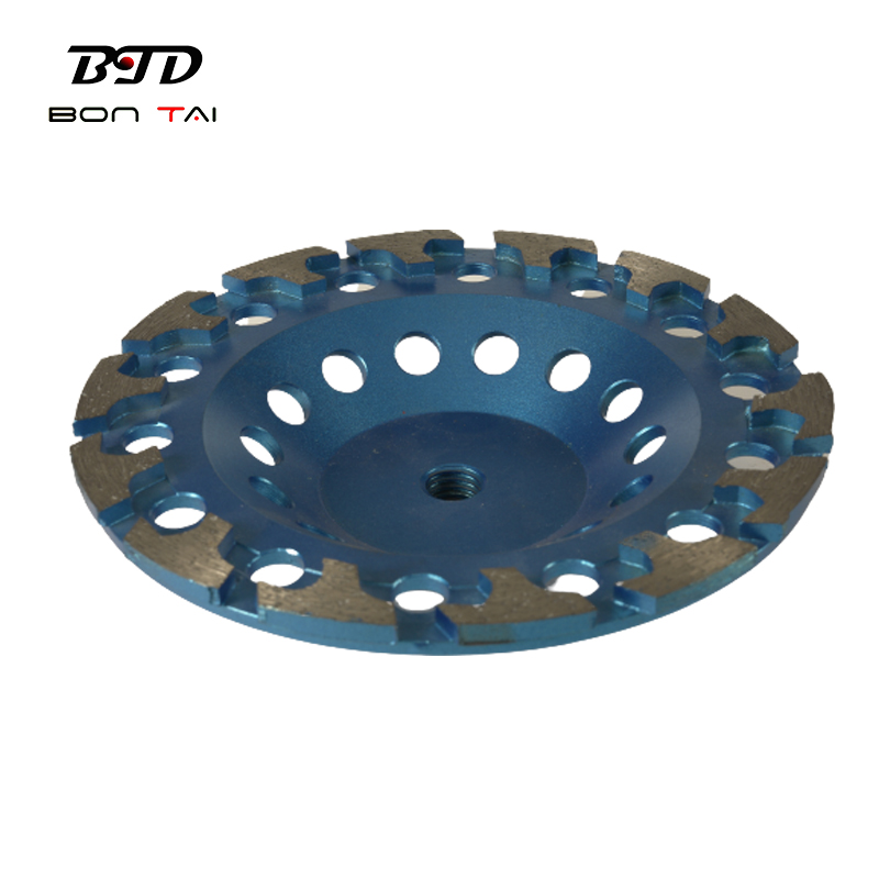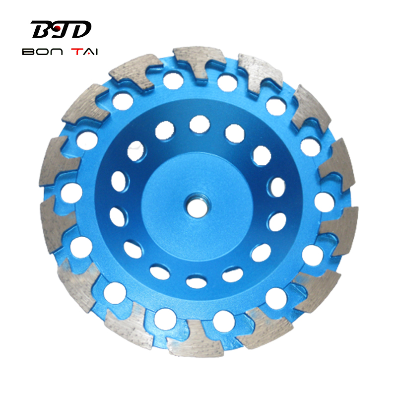 ટી આકારના સેગમેન્ટ કપ વ્હીલનો ઉપયોગ સામાન્ય રીતે કોંક્રિટ, ટેરાઝો અને પથ્થરની ફ્લોર સપાટીને ગ્રાઇન્ડીંગ અને લેવલિંગ માટે થાય છે, તેનો ખાસ ડિઝાઇન સેગમેન્ટ આકાર ઝડપી ગ્રાઇન્ડીંગ ગતિ અને ઉચ્ચ કાર્યક્ષમતાને સક્ષમ બનાવે છે. શરીર જાડું, વધુ ટકાઉ છે, સૂકી કાર્યકારી પરિસ્થિતિમાં બળશે નહીં, શરીર પર ઠંડકવાળા છિદ્રો ગરમીનું વિસર્જન, સરળ ચિપ દૂર કરવા અને વધુ સારા ગ્રાઇન્ડીંગ પરિણામોમાં વધારો કરે છે.